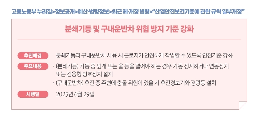 그중에서도 분쇄기, 혼합기, 파쇄기 같은 위험기계와 구내운반차 관련 안전기준 소식을 들고 왔어요!