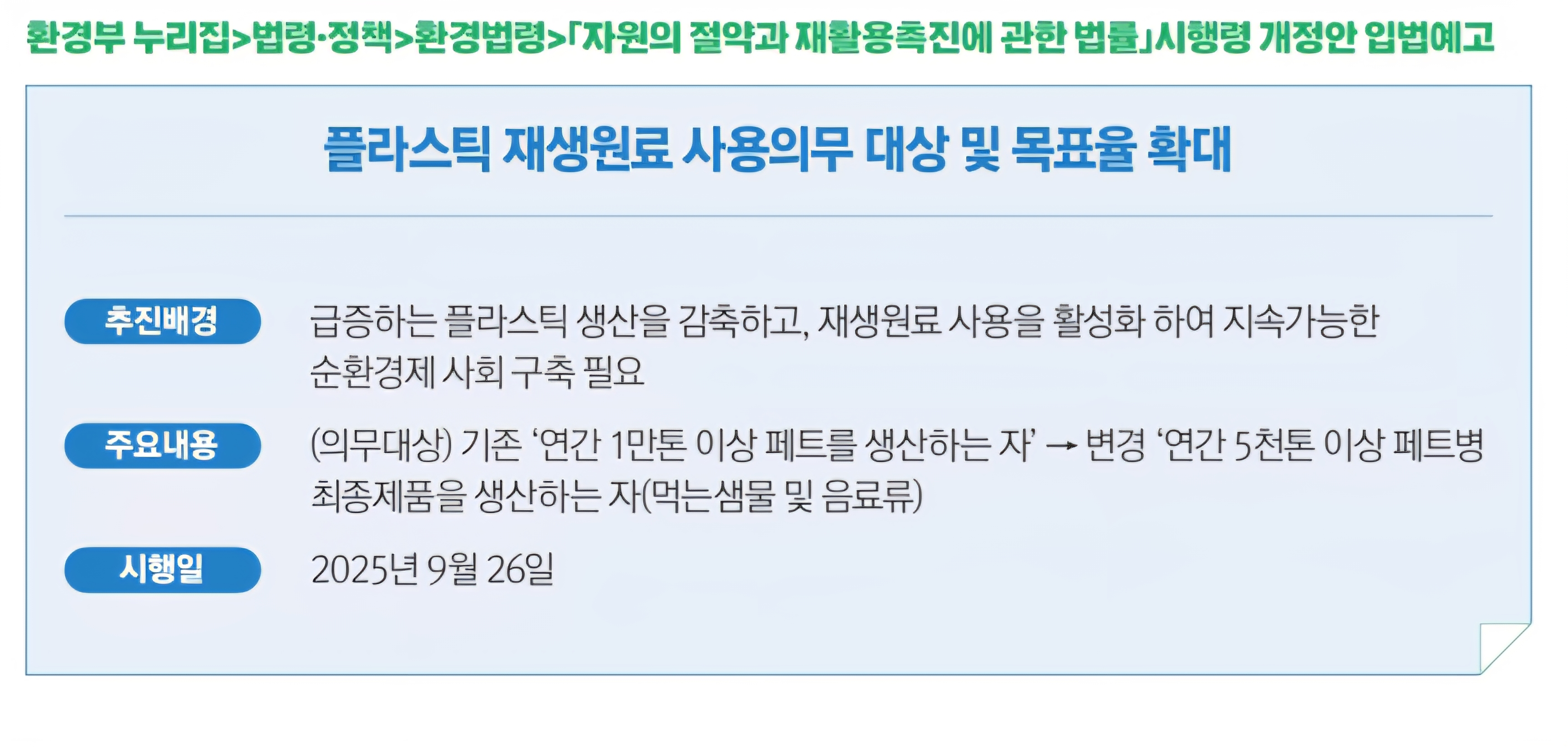 - 적용 대상 변경: ‘연 1만 톤 이상 페트 수지 생산자’ → ‘연 5천 톤 이상 페트병 최종제품 생산자’로 바뀜