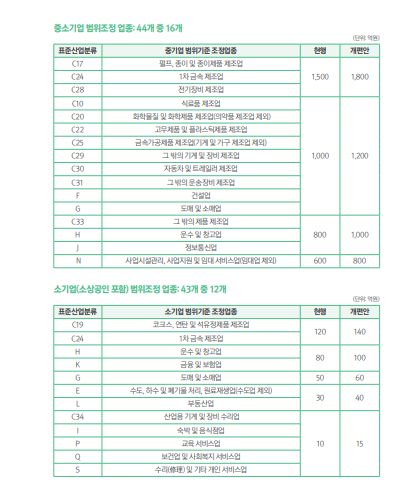 - 44개 업종 중 16개 업종의 매출상한 200억~300억 원 확대 - 소기업 기준도 상향