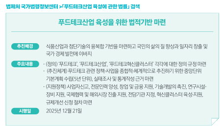 이번 법률 제정은 푸드테크 산업을 국가가 중심이 되어 제대로 육성하겠다는 의지를 보여주는 첫걸음이죠.