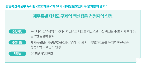 바로 제주특별자치도가 세계동물보건기구(WOAH)로부터 ‘구제역 백신접종 청정지역’으로 공식 인정
